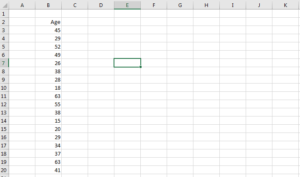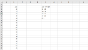 Assume you have an age column in MS Excel and you want to group the age into five classifications. The data look as follows;