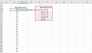 3. Go to cell C3 and enter the following formula =VLOOKUP(B3,Age_Table_Array,2,TRUE).